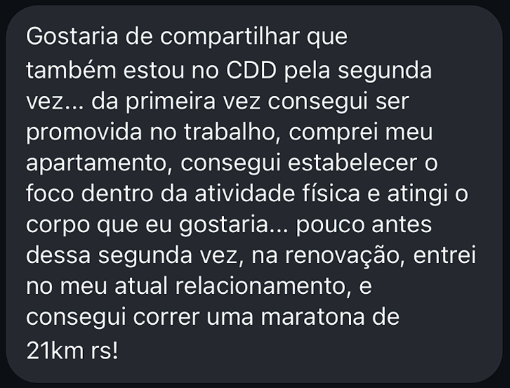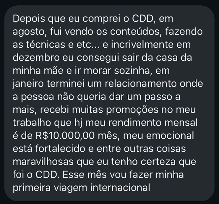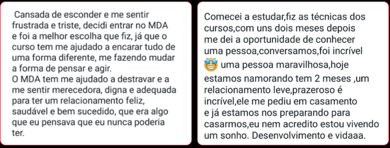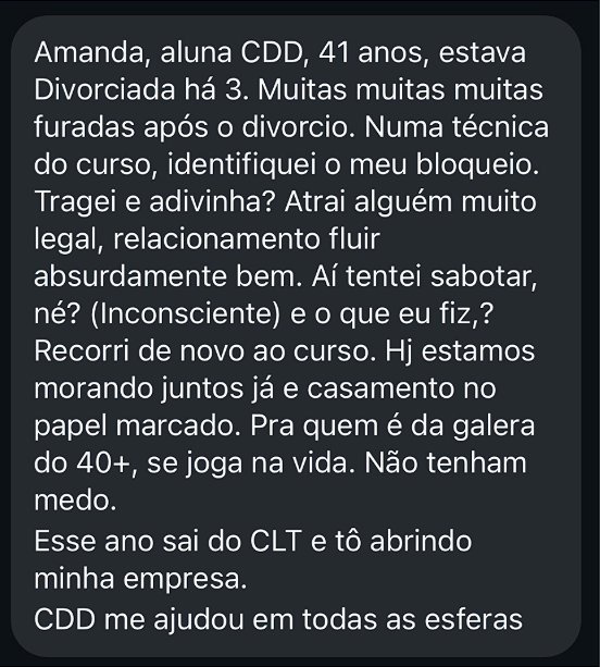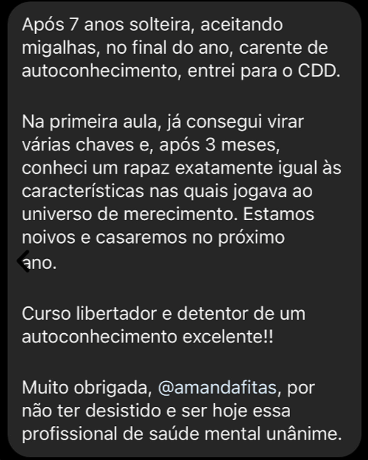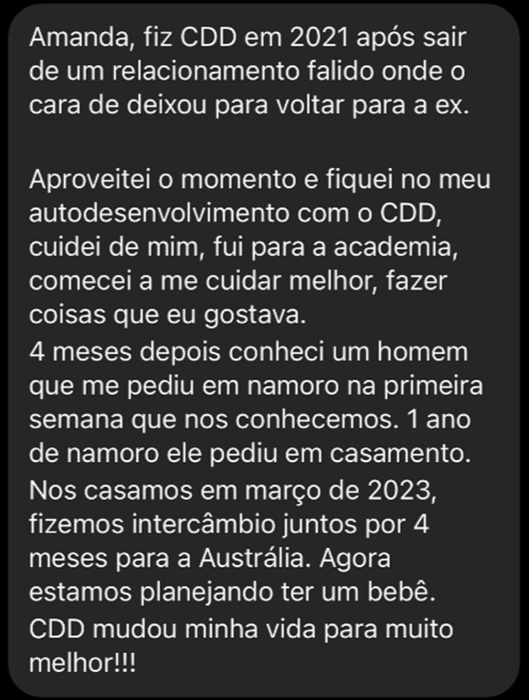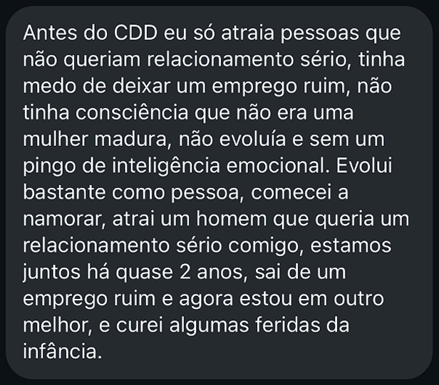 No CDD você tem aulas e exercícios de autodesenvolvimento e técnicas de alto impacto para tratar questões do seu emocional (como traumas, inseguranças…) que estão te atrapalhando de ser mais confiante e segura no amor e na vida.